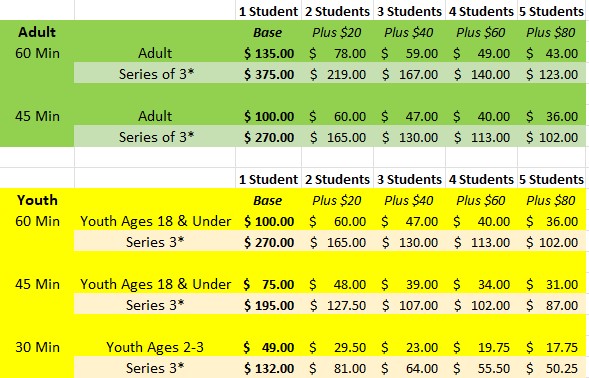 * Series are valid for a two-month time frame from start date for effectiveness (or best to sign up for single lesson rate).